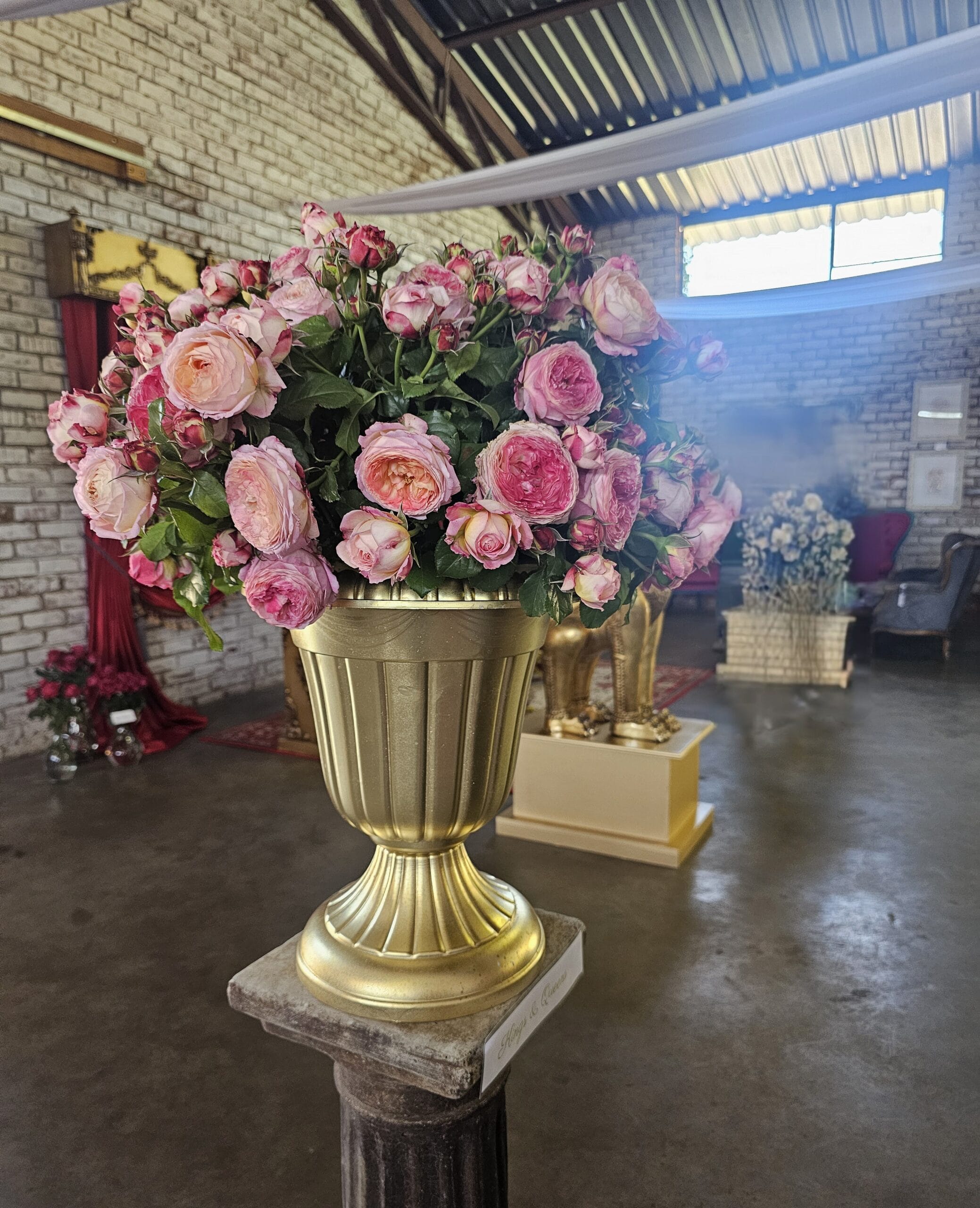 Sophisticated gold sets the stage for monochromatic pink roses.