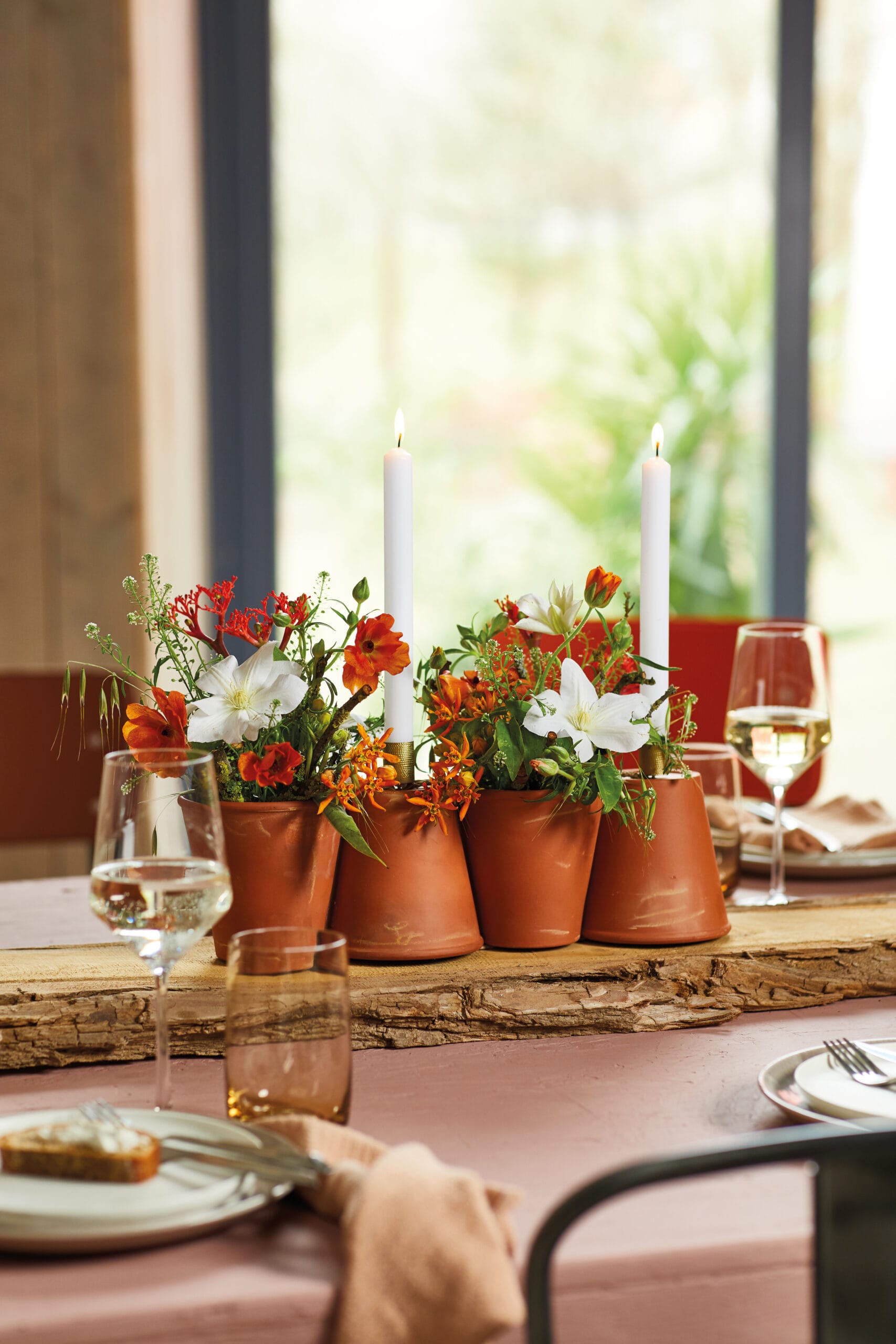 Terracotta pots bring a laid-back, rustic charm to this cozy centerpiece.