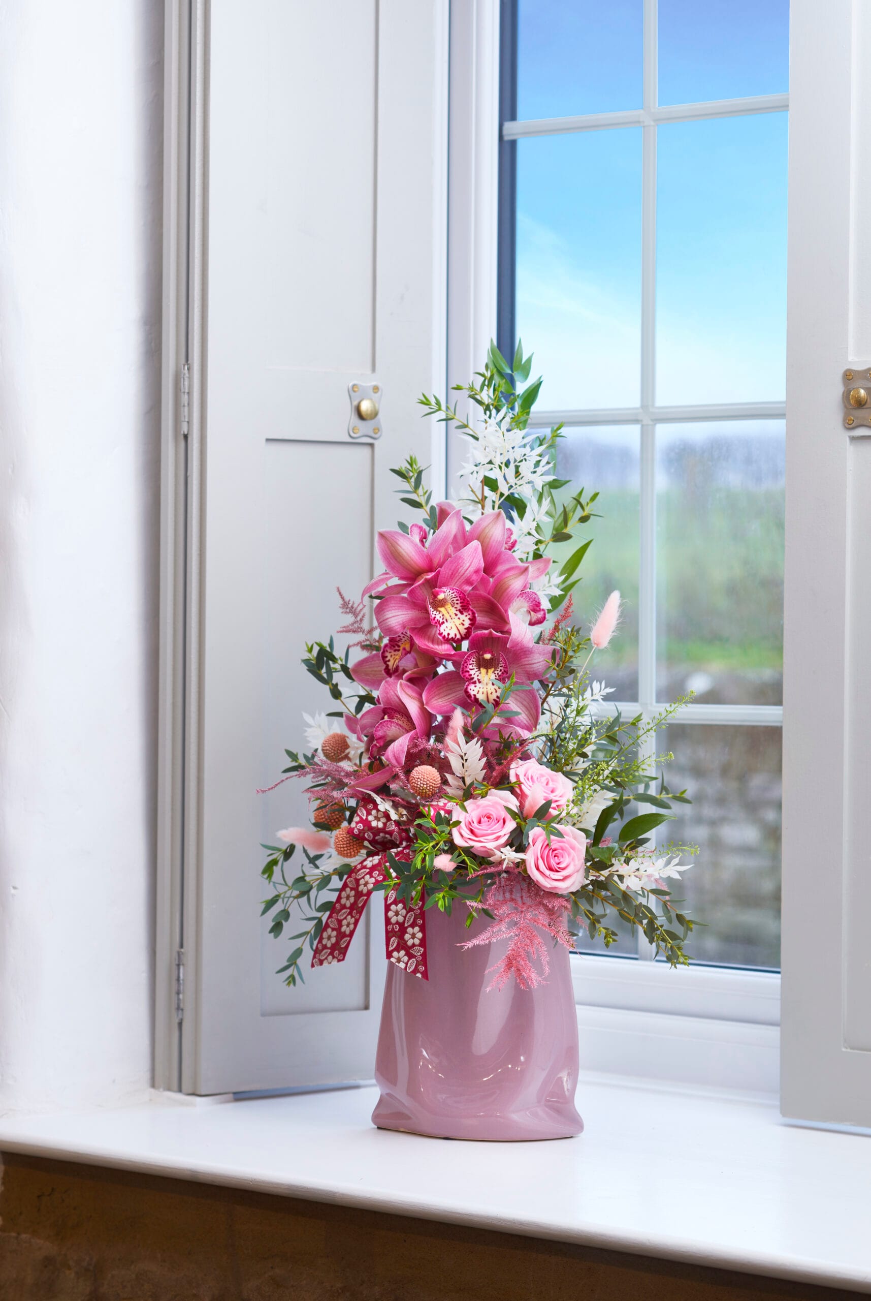 Love takes shape through a bold red outline filled with playful pink blooms.