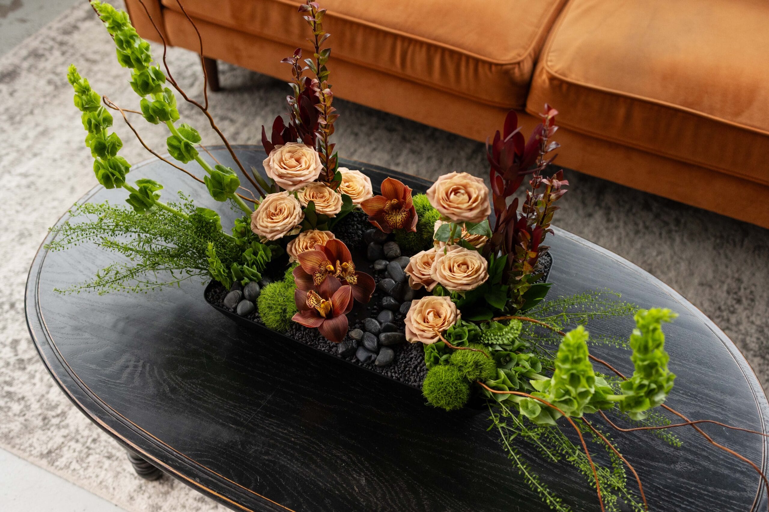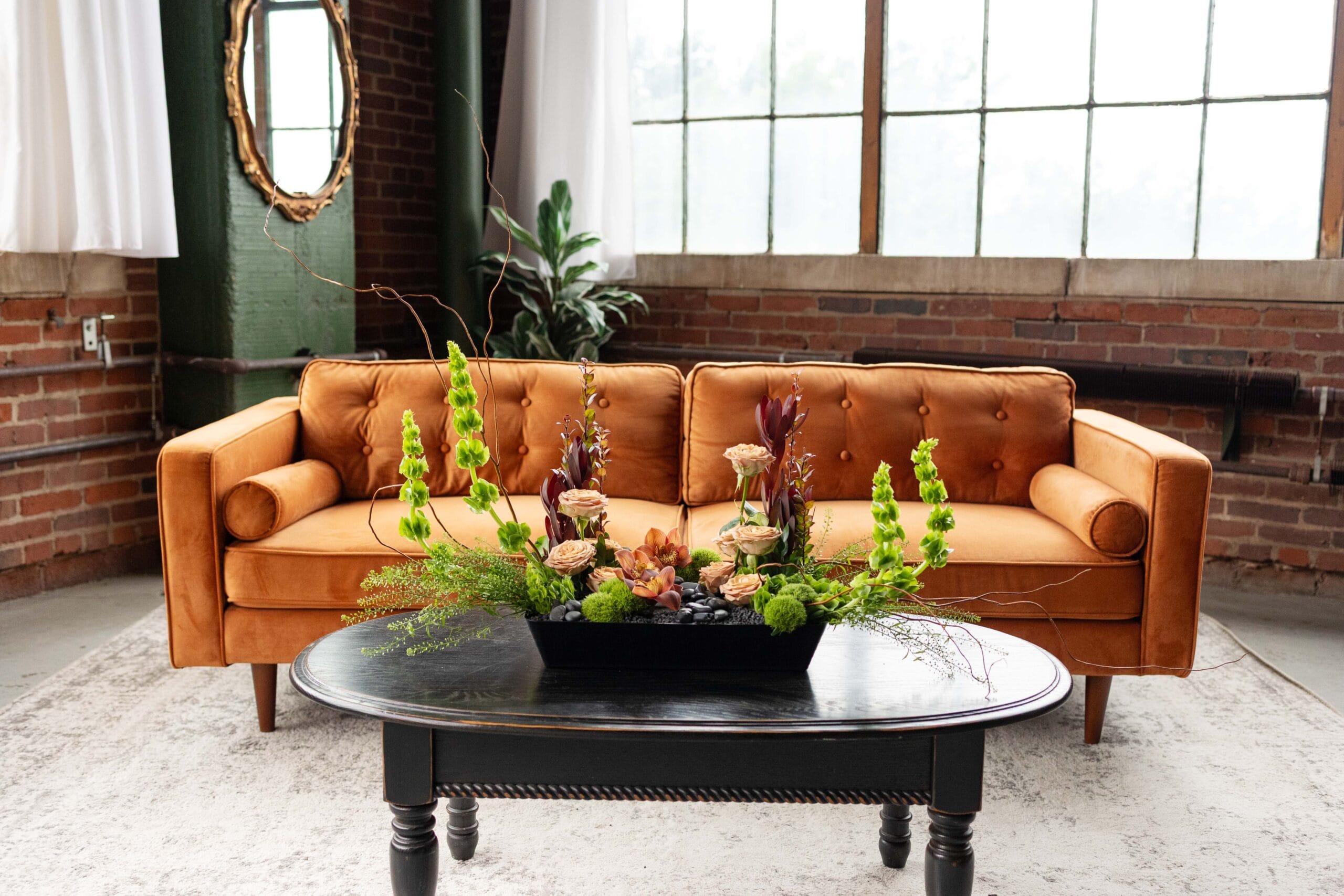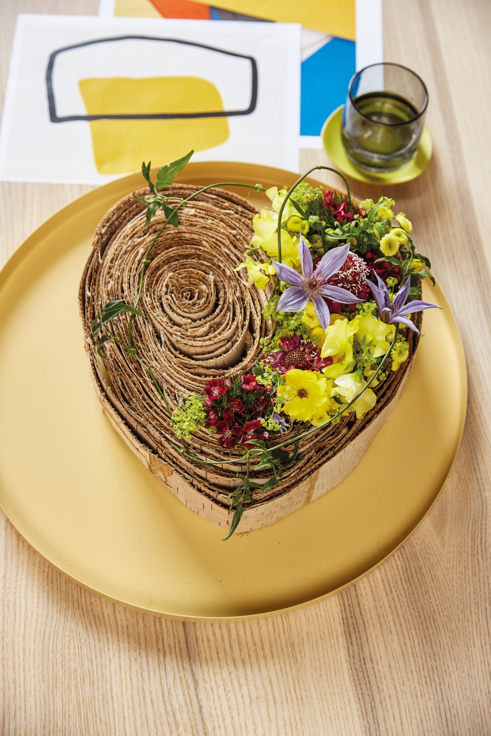 Neutral swirls embrace vivid flowers.